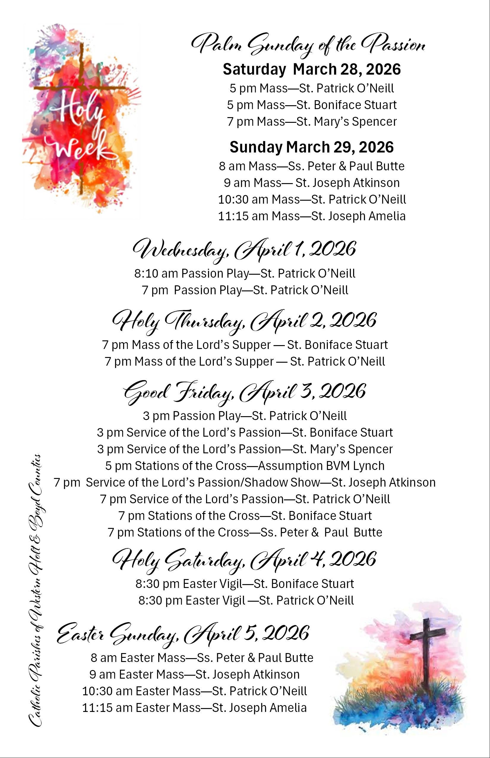 Calendar of events for all the parishes in the Catholic Parishes of Western Holt and Boyd Counties.